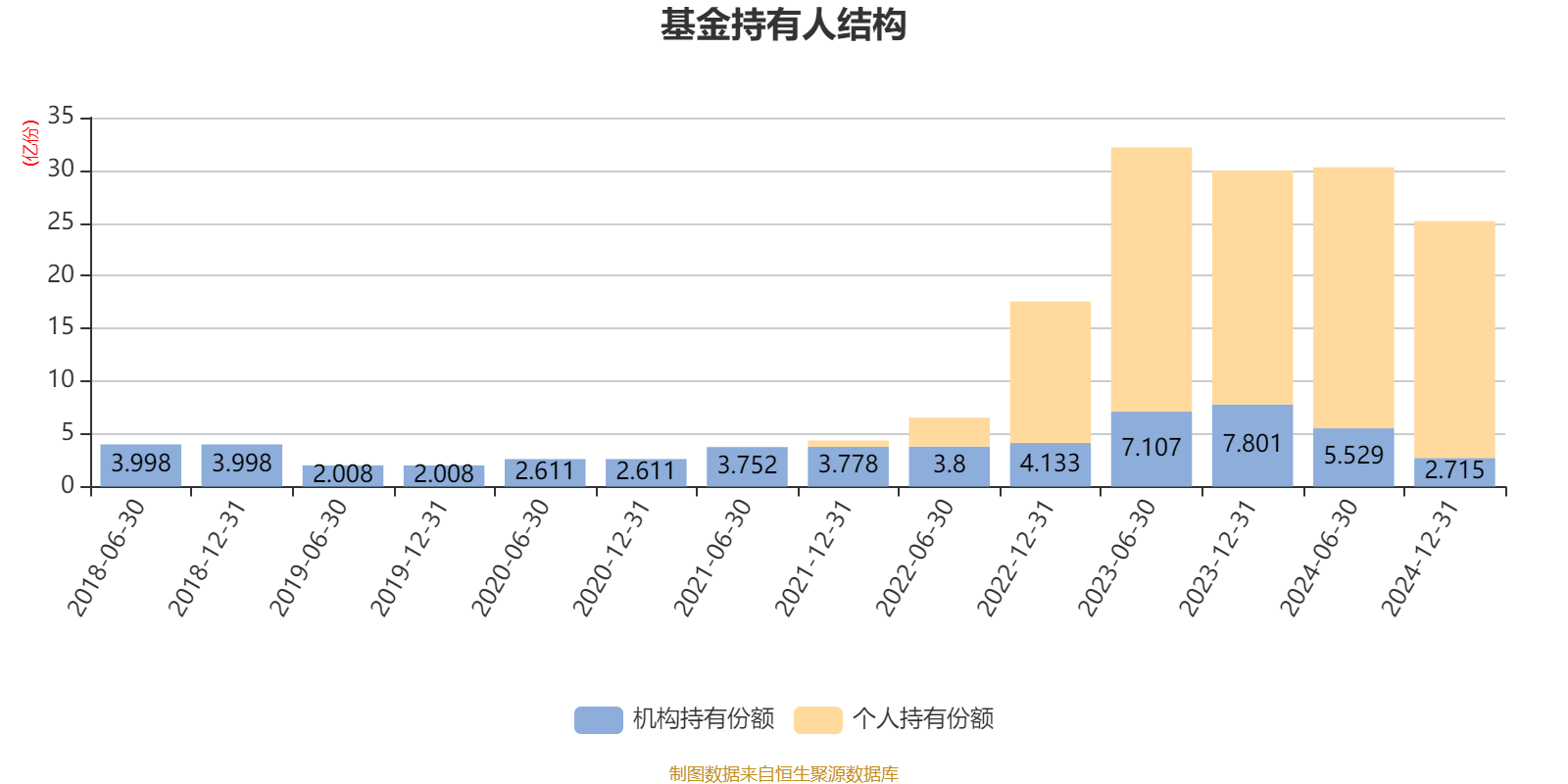截至2024年12月31日,基金持有人共计25.21万户,合计持有25.18亿份。其中管理人员工持有81.71万份,占比0.03%,机构持有份额占比10.78%,个人投资者占比89.22%。